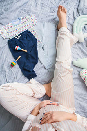Pregnant woman with baby accessories on bed