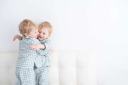 Two toddler baby twin boys in pajamas hugging at home on white background
