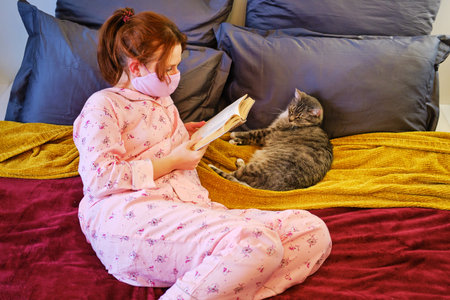 A young woman in a makeshift medical mask lies with the pet during the epidemic of the coronavirus. A girl in pajamas on the bed reading a book to a cat