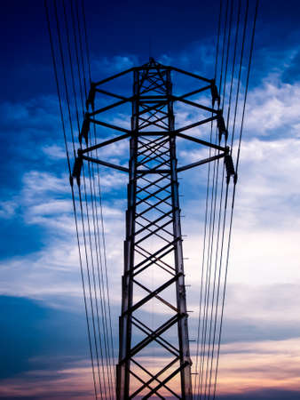 Power plant silhouette At sunset, a high-voltage tower stands against the sky. Electrical transmission wires from the bottom.