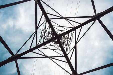 Electricity distribution tower with copy space. High voltage power lines under cloudy sky. Minimalist view from below on poles with wires at overcast weather. Atmospheric electrical background.
