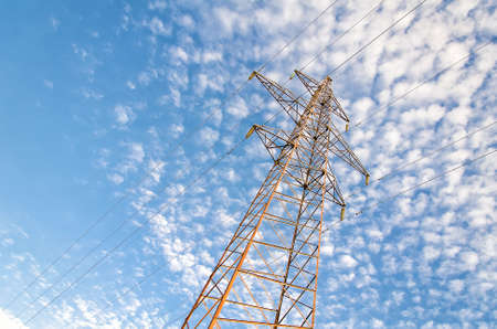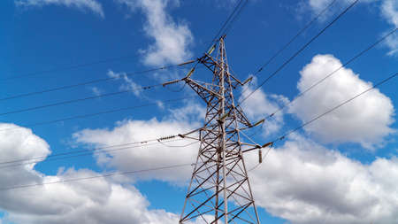 Power pole on the background of a blue sky with white clouds. High voltage line. Steel structural elements.