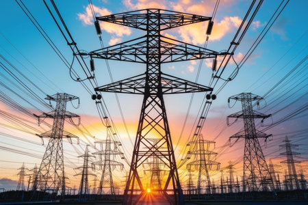High-voltage pblems tower against the sky at sunset, power grid concept. High contrasting colors, stock photo, --chaos 30 --ar 16:9 --v 6.1 Job ID: fefbc0d2-9743-4ff9-b5c7-e09e92230f48