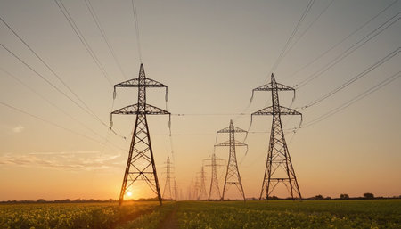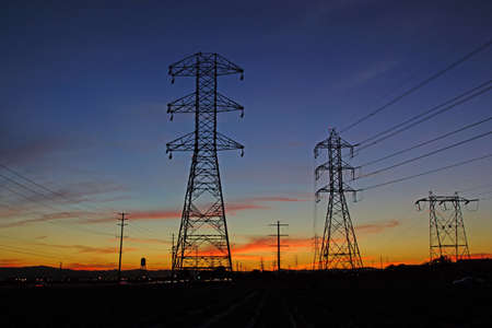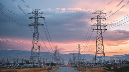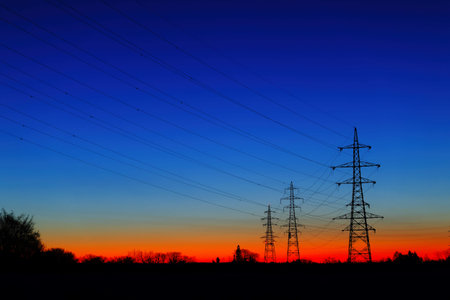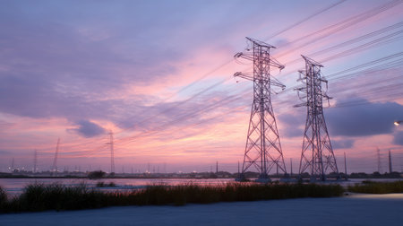 Amidst a dusky skyline, towering electrical pylons rise, silhouetted against vibrant hues of blue and orange. Bright city lights twinkle in the background as vehicles glide by.