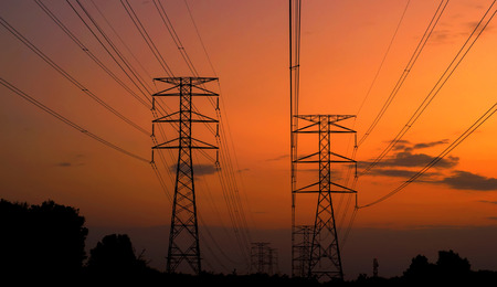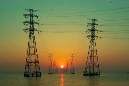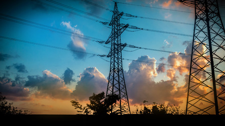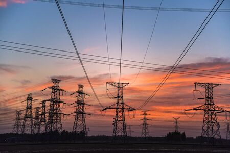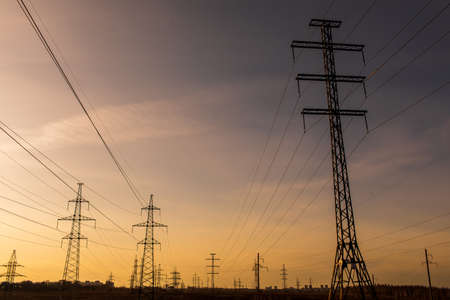 silhouette of high voltage electric poles and lines, High voltage electric transmission tower at sunset sky background.