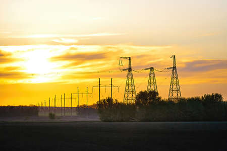 High voltage electric pole and transmission lines in the evening. Electricity pylons at sunset. Power and energy. Energy conservation. High voltage grid tower with wire cable at distribution station.
