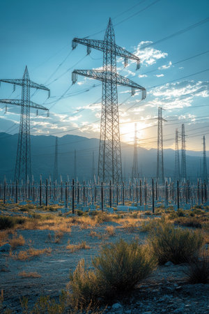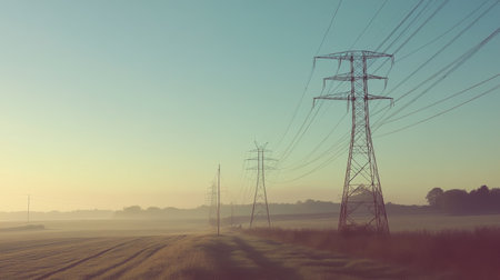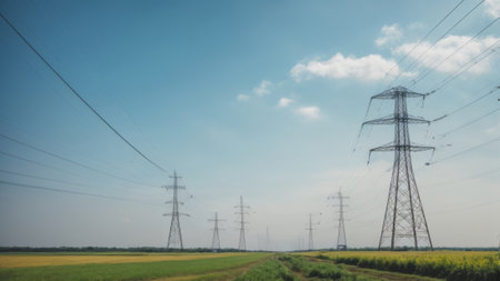 A stunning view of high voltage power lines stretching into the clear blue sky, showcasing modern energy infrastructure against a vibrant and serene backdrop.