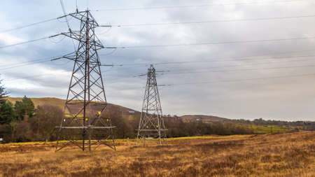 Electricity pylons in a field on a cloudy day in winter at Kendoon Power Station, on the Galloway Hydro Electric Scheme, Scotland