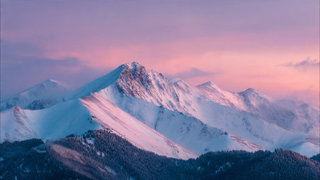 Ultra-detailed peaks glow with soft hues during a perfect winter dawn.