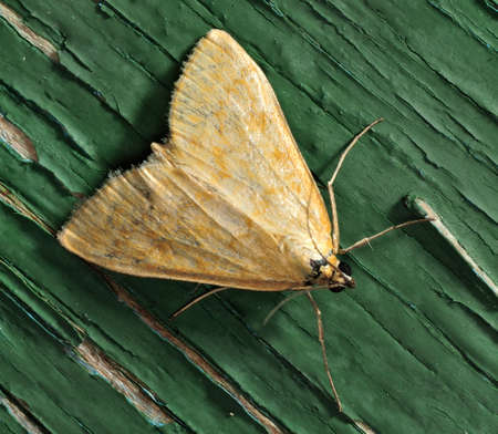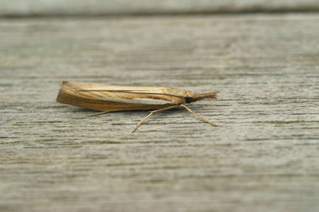 Natural closeup on a Common Grass-veneer crambid moth, Agriphila tristella sitting on wood