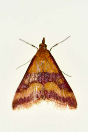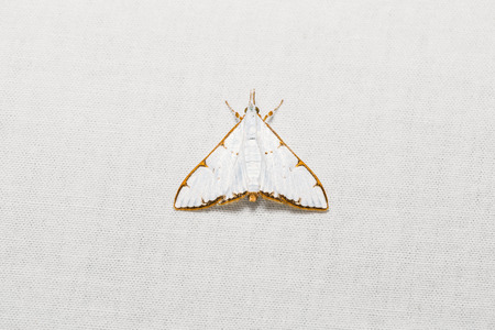 Close up of Cirrhochrista aetherialis moth on white screen, flash fired