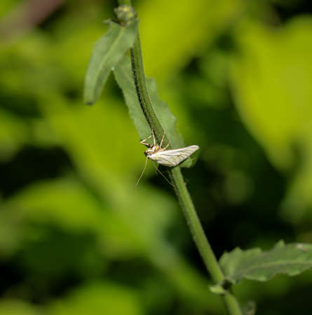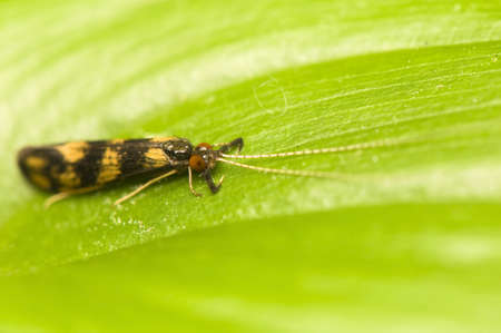 Close-up image of a long-legged butterfly, Nemophora degeerella. green leaf.
