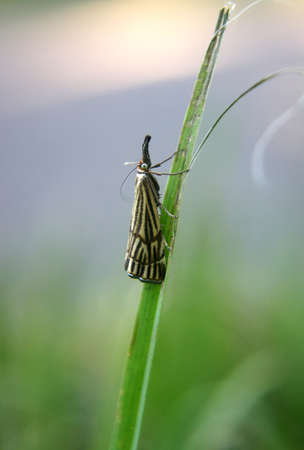 A macro shot of a moth on a blade of grass