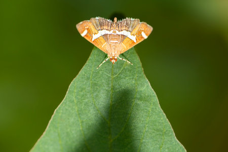 Loxostege sticticalis known as the beet webworm moth rests on vibrant green leaf showing its unique wing patterns in a garden setting during the afternoon.