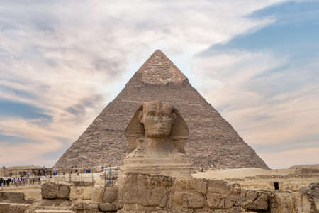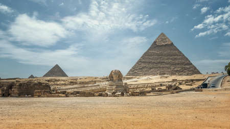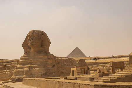 Giza, Egypt - April 20, 2020: The pyramid of Chephren and the Great Sphinx of Giza, Egypt