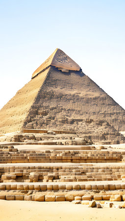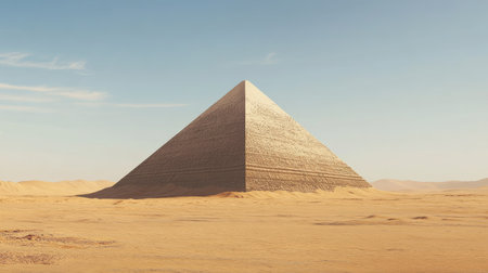 Majestic pyramid rising from the barren desert, with ample copy space in the clear sky and surrounding sand.