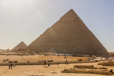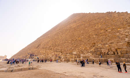 CAIRO, EGYPT - JANUARY 28, 2019: Tourists in front of the Great Pyramid of Giza