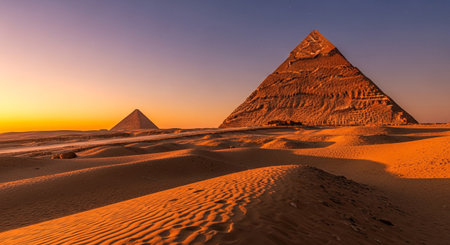 Majestic pyramids rise from the desert sands under a vibrant sunset sky in egypt