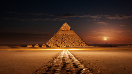 Majestic great pyramid on mountain peak shining brightly under the enchanting glow of the moonlight