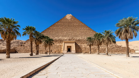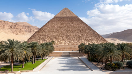 A majestic pyramid stands tall amidst lush palm trees, creating stunning contrast