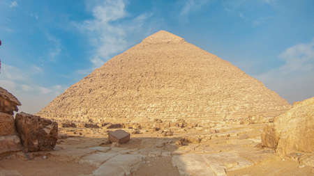Egyptian pyramid in Giza. Architectural heritage of ancient Egyptian civilization. Ruins and statues of ancient Egypt.