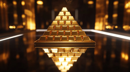 A pyramid of gold bars resting on a mirrored surface, creating a dramatic symmetrical reflection