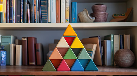 Multicolored wooden pyramid toy on a bookshelf, surrounded by books and decorative items.