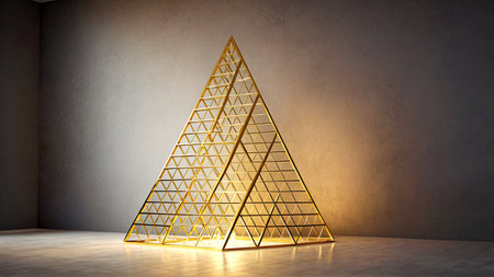 A stunning golden pyramid structure featuring triangular shapes, set against a dark textured background, symbolizing wealth and stability in design.
