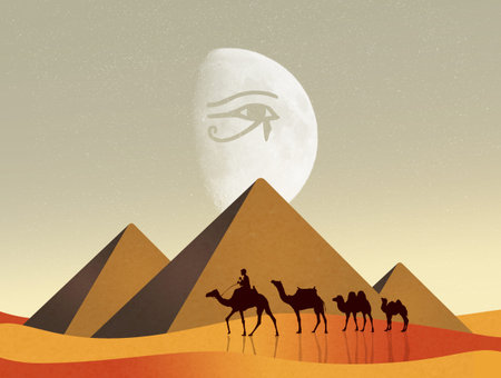 Egyptian pyramid in the desert. Vector illustration in retro style.