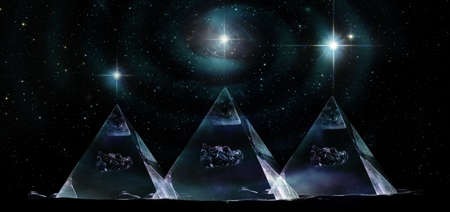 A breathtaking night scene featuring illuminated pyramids against a starry sky.