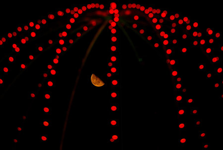 The orange moon is waxing crescent at night, a natural satellite against the starry sky.