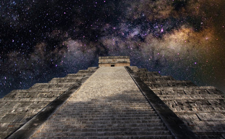 Ancient Mayan ruins at night in Yucatan, Mexico.