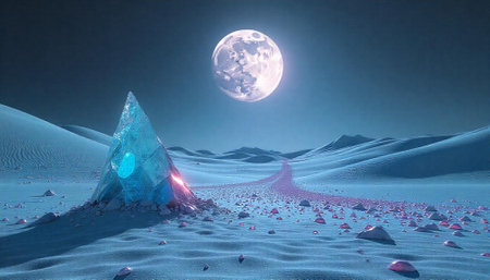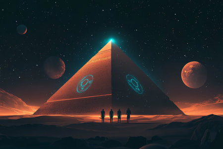 Mysterious pyramid in ancient desert cosmic encounter with alien technology and glowing symbols