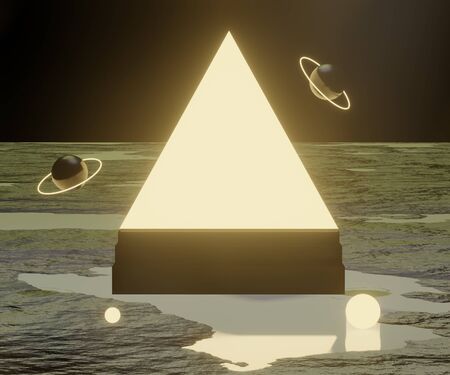 Futuristic landscape with pyramid and lake at night. 3D rendering