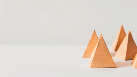 A group of five small, orange paper pyramids sits on a white surface, spread out in a semi-circle formation. The pyramids are all the same size and shape, with a slightly textured surface. There is a lot of negative space to the left of the image.