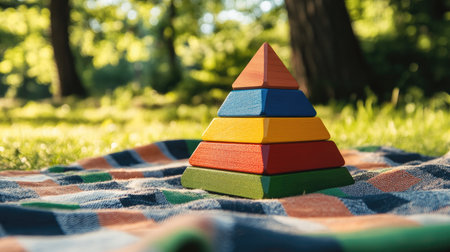 Multicolored wooden pyramid toy placed on a picnic blanket outdoors on a sunny day.