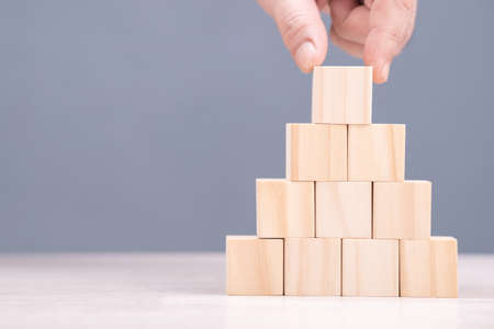 Closeup of businessman making a pyramid with empty wooden cubes. Concept of business hierarchy.