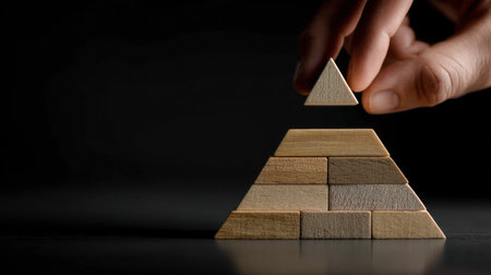 A hand carefully places a wooden triangle atop a pyramid made of rectangular blocks, illustrating concepts of balance, creativity, and architectural design against a sleek black background.