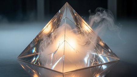 A clear glass pyramid with sharp geometric facets emits a soft internal glow, surrounded by swirling white smoke.
