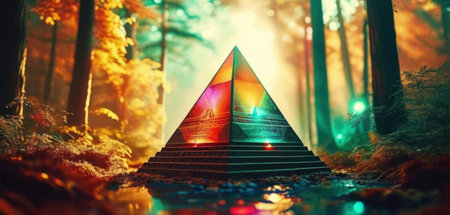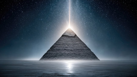 A clear pyramid is lit up by a bright light. The light is shining on the pyramid, creating a beautiful and mesmerizing effect. Concept of wonder and awe, as the pyramid appears to be a magical