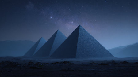 Stunning view of ancient pyramids set against a clear night sky filled with stars. The tranquil atmosphere enhances the architectural beauty and evokes mystery.