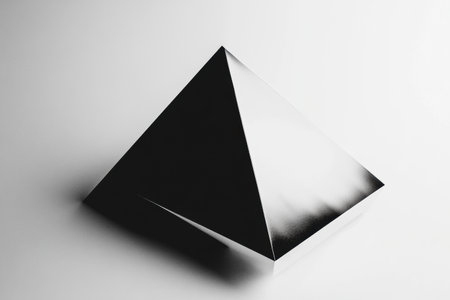 A black pyramid sculpture sits on a smooth light surface, creating striking shadows that emphasize its angular shape and design.