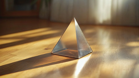 A clear geometric pyramid prism sits elegantly on a wooden floor, capturing and reflecting soft natural light, creating a tranquil and artistic atmosphere.