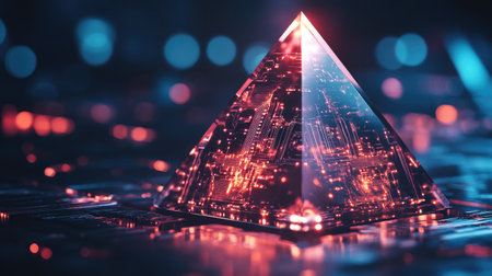 Floating D pyramid with illuminated circuits symbolizing AI progression. Gradient background with dark tech vibes.