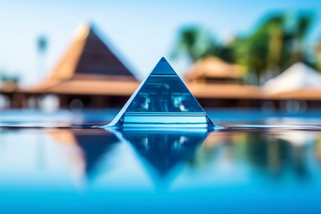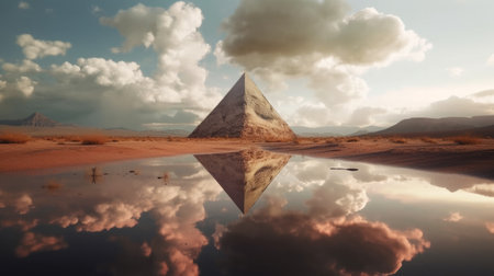 A pyramid is shown in a sandy area with a cloudy sky in the background. The pyramid is made of glass and is placed on a table. The scene has a calm and serene mood