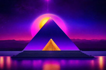 Sci-fi landscape with 3D mountain pyramids in retrofuturistic synthwave style, orange light, generative ai art