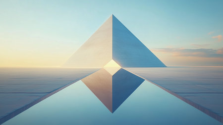 A mirrored pyramid is suspended above water, reflecting the soft hues of the sunset. The composition showcases a tranquil environment with a calm water surface mirroring the sky's colors. This image could be used for various projects needing a sense of serenity or conceptual visual representation.