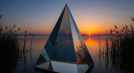 A clear, triangular prism stands at the water's edge, reflecting the sunrise. The image presents a glass pyramid against a backdrop of calm water and reeds, painted with warm orange and blue tones. The composition employs a low angle, capturing the reflective surfaces and dramatic lighting. Suitable for artistic projects, design, or conceptual imagery.