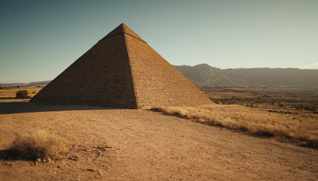 Majestic pyramid rising from the barren desert, with ample copy space in the clear sky and surrounding sand.