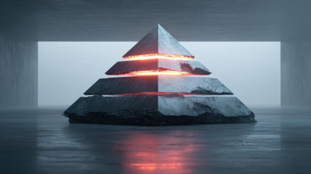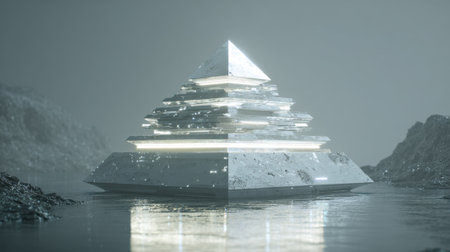 A striking pyramid stands amidst calm waters, its dark surface sharply contrasting with a pale sky. Surrounding mist adds an aura of mystery, evoking feelings of solitude and reflection.